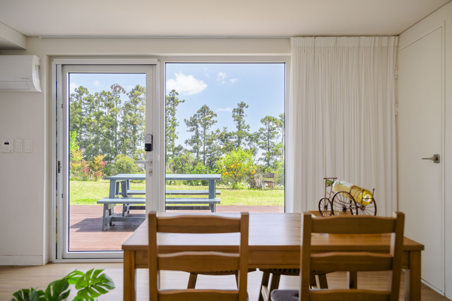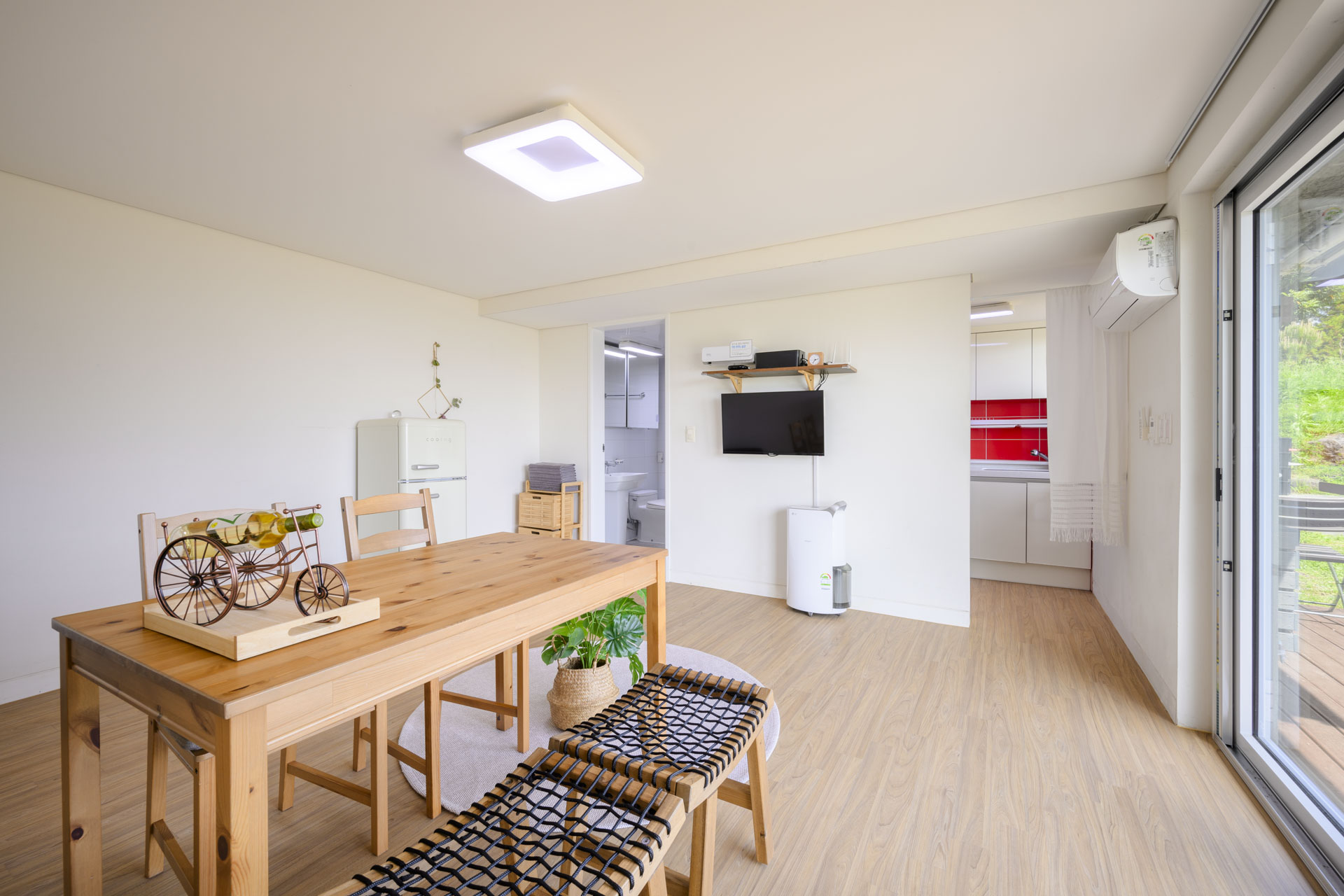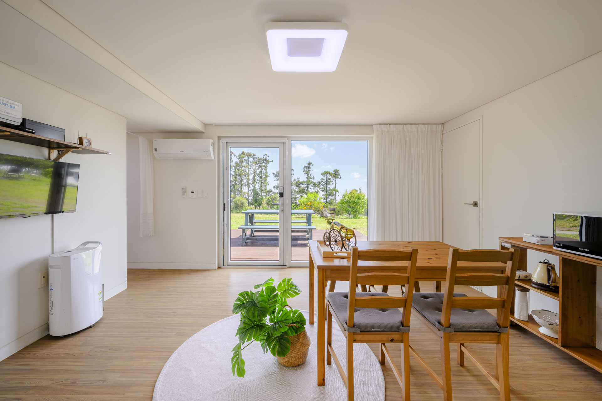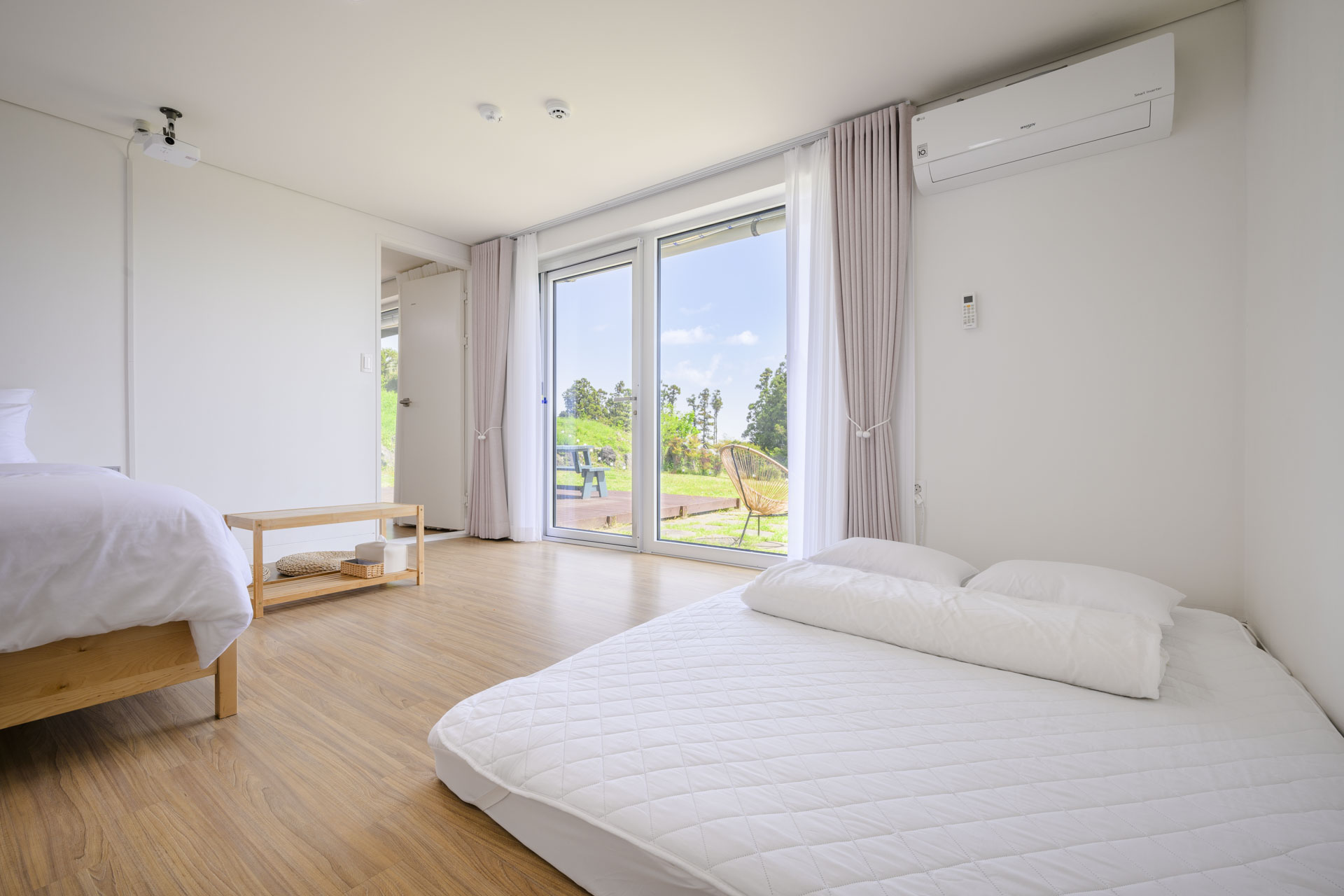 15평 마당층 정원뷰 방(퀸침대1, 퀸매트1) + 거실 + 화장실 + 주방 정원뷰 객실이며 마당층 객실이라 아이와 추억을 남기기 좋습니다. 사계절 내내 룸 컨디션이 쾌적하며 여름엔 시원하고 겨울엔 따듯합니다. Facilities and Services TV 빔프로젝트 냉장고 전자레인지 에어컨2(거실1 방1) 제습기 가습기 선풍기 공기청정기 드라이기 세탁기 건조기 욕실용품 (샴푸, 린스, 바디워시, 비누, 칫솔, 치약, 샤워타올)