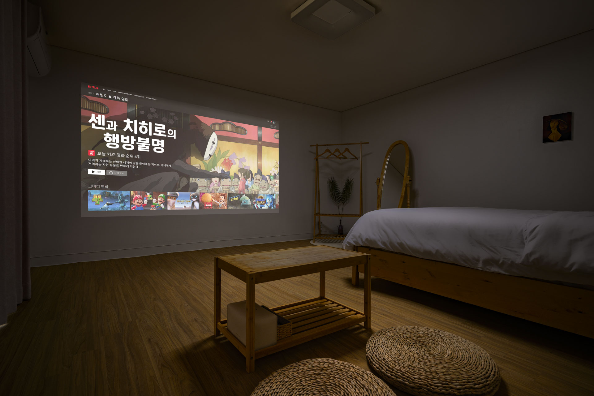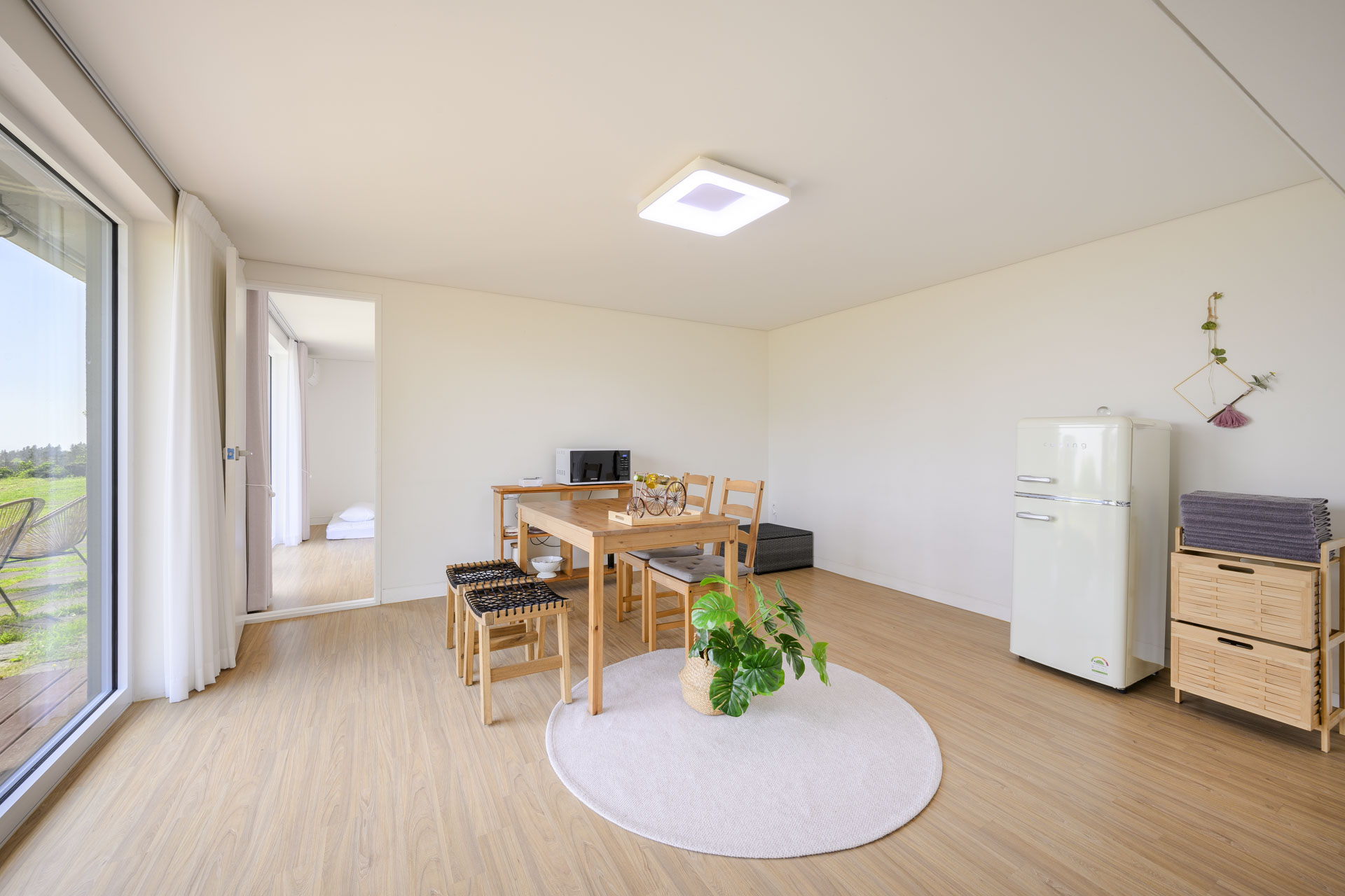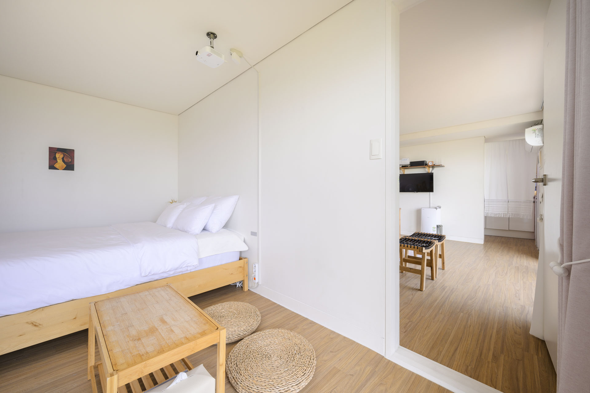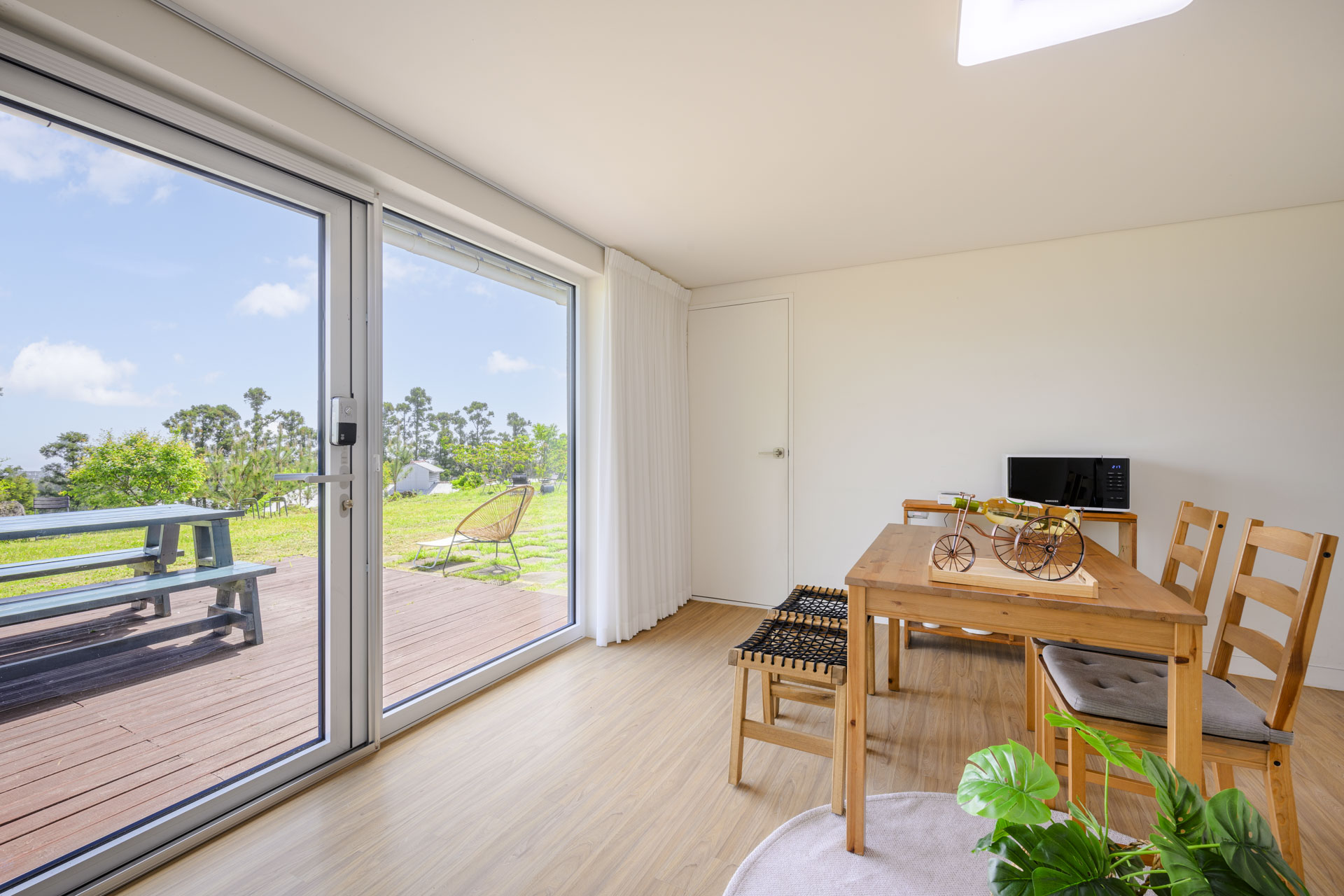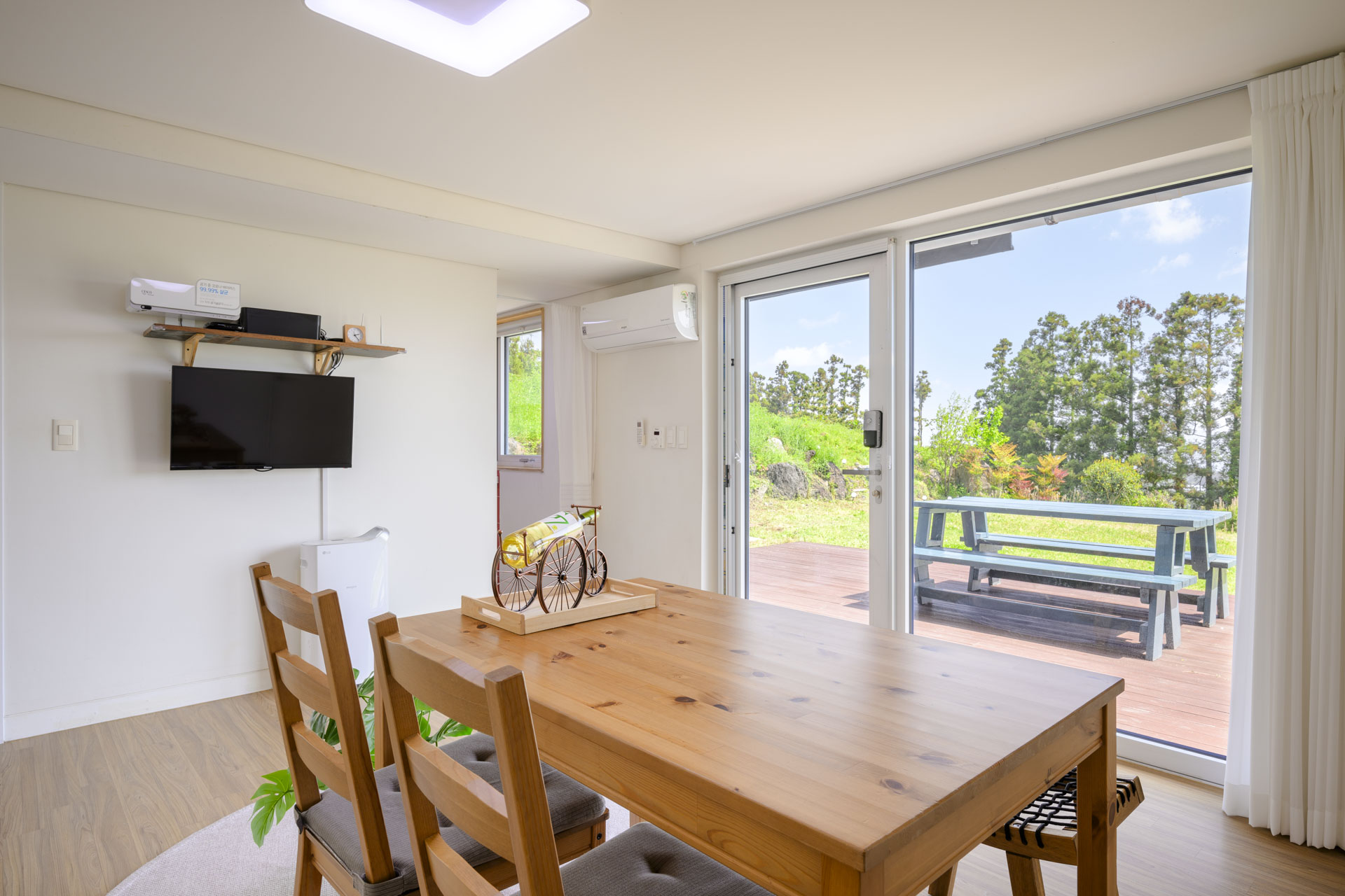 15평 마당층 정원뷰 방(퀸침대1, 퀸매트1) + 거실 + 화장실 + 주방 정원뷰 객실이며 마당층 객실이라 아이와 추억을 남기기 좋습니다. 사계절 내내 룸 컨디션이 쾌적하며 여름엔 시원하고 겨울엔 따듯합니다. Facilities and Services TV 빔프로젝트 냉장고 전자레인지 에어컨2(거실1 방1) 제습기 가습기 선풍기 공기청정기 드라이기 세탁기 건조기 욕실용품 (샴푸, 린스, 바디워시, 비누, 칫솔, 치약, 샤워타올)